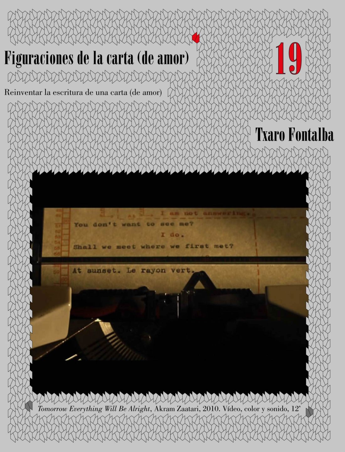 Mi propuesta Figuraciones de la carta (de amor) toma como punto de partida el trabajo que llevo realizando en mi blog TALLER DE CARTAS DE AMOR. Seleccioné tres artistas culturalmente muy diferentes y con planteamientos muy diferentes. En Elena del Rivero y Akram Zaatari lo sentimental y más en concreto el amor están muy presente en sus obras desde posiciones sexuales diferentes. En la obra de Wim Delvoye la carta de amor es más puntual en su trayectoria.