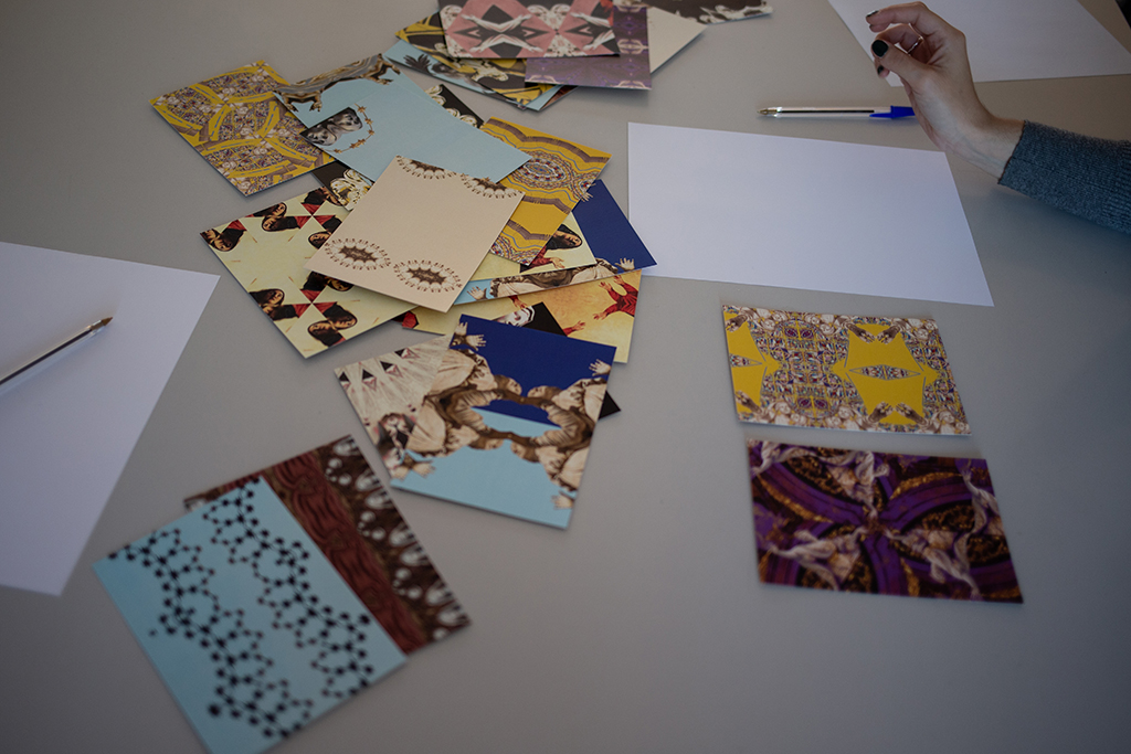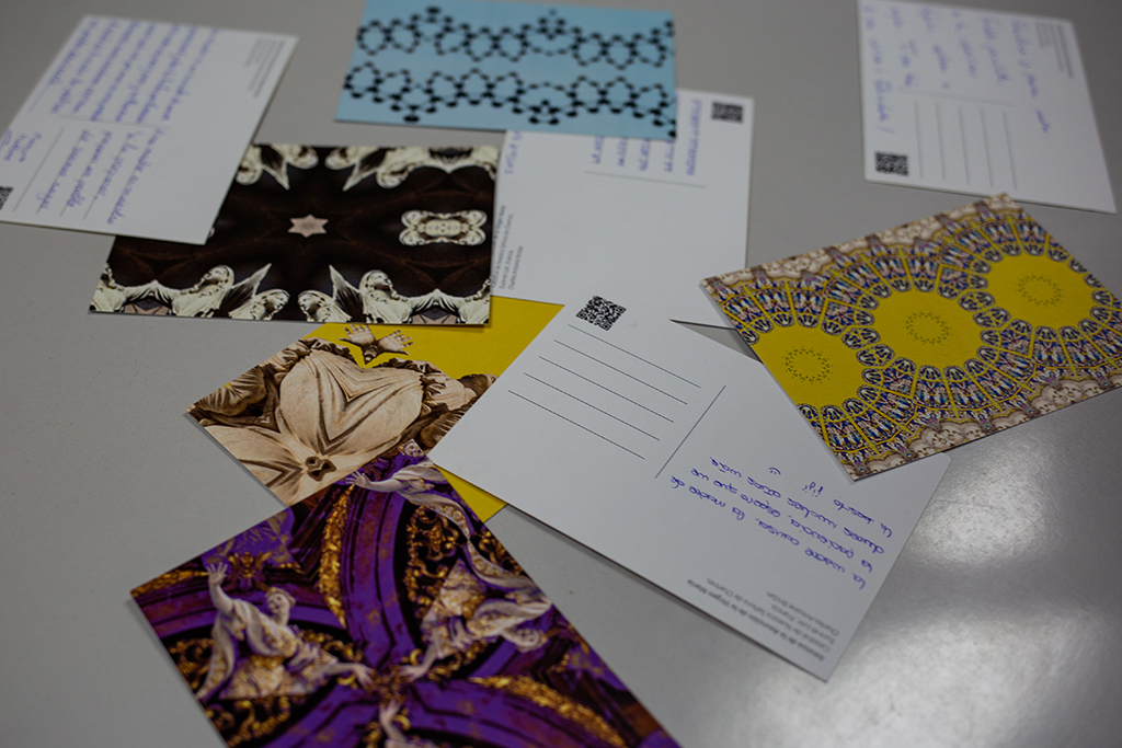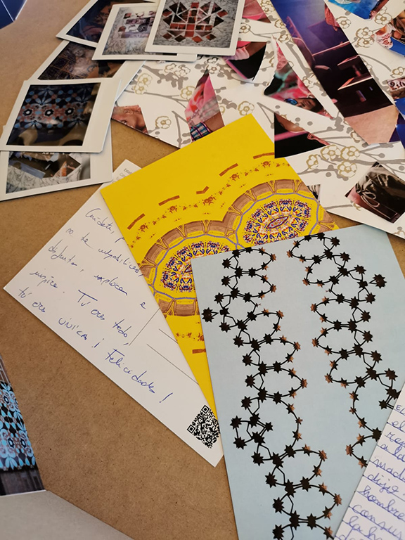 Invité a las participantes a escribir una carta de amor a la madre, utilizando una tarjeta postal de la colección “Kaleidoscopias”, el laboratorio procesual de “Al aire de su vuelo”. Fue muy gratificante ver cómo por primera vez eran utilizadas y puestas en circulación.