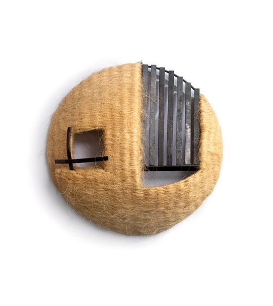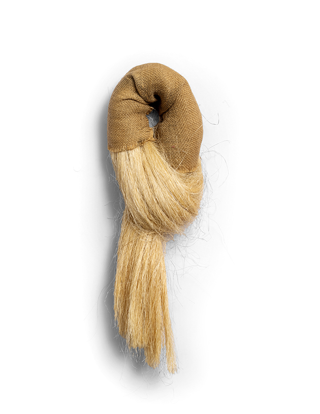 En Sin título (1996) la figura del nudo reaparece. Un nudo-abrazo, un abrazo-nudo de tela y fibra textil. Un nudo corazón vegetal que evoca una crin animal. ¿Qué somos sino una urdimbre de nudos y ataduras? Estamos hechos de las hebras, trazas y líneas que la vida va dejando en cada una: los encuentros, las palabras y también las pérdidas, lo que hemos amado y lo que hemos dejado atrás. Somos intimidad, cuerdas anudadas hacia dentro y hacia fuera, sin distinción entre el interior y el exterior.