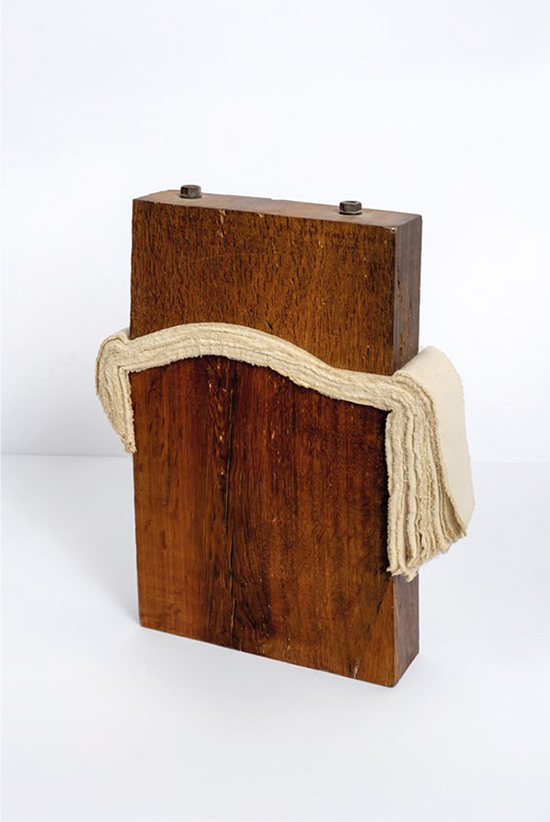 Dialogando con el minimalismo y bordeando el arte povera y el arte bruto, la artista dota a su obra de contenido figurativo y de una intención referencial. En Sin título (1985), utiliza la geometría de un modo singular. Reutiliza un bloque de madera atravesado por un conjunto de telas apiladas, evocando mediante una línea sinuosa el curso de un río o el perfil de un paisaje. A modo de trazo gestual, rompe, separa y eleva la materia para darle ligereza, haciendo penetrar lo fluido, lo blando y lo moldeable en la opacidad de la madera. En la obra de Sueskun, la geometría dialoga con lo terrenal, lo orgánico y lo vital, con lo maternal y lo femenino, revelando su singular inscripción y diferencia.