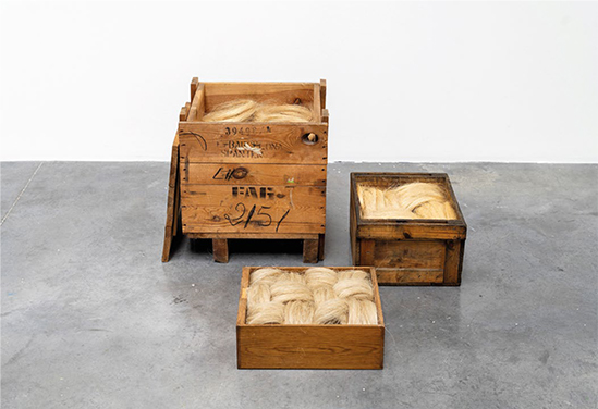 Sin título (1988) es una obra que consiste en un elemento vertical: un palo de madera apoyado en el suelo al que se anuda o enreda un «mechón» de sisal. La artista nos cuenta que en el origen de esta obra está la evocación de un recuerdo, la visión de lo que queda retenido en un puente tras una riada. “Las ideas son como un riachuelo. El agua baja, en unos sitios se remansa y humedece la tierra, y en otros pasa. Con las ideas ocurre algo parecido”. Una vez más, la artista transforma una imagen o un recuerdo —un remolino súbito en un curso de agua— en una escultura. El agua, como el tiempo, fluye y se escapa. No hay modo de controlar el tiempo, por eso lo intentamos a través del espacio, como si quisiéramos clavar una estaca en la corriente del tiempo o ponerle un dique que lo detenga por un instante, aunque tarde o temprano, también se lo llevará por delante. El sisal, un material que evoca el pelo, se moldea de manera similar y conserva la memoria de su manipulación. Con el paso del tiempo, sus cualidades se alteran, poniendo de manifiesto lo efímero y la naturaleza perecedera de la existencia.