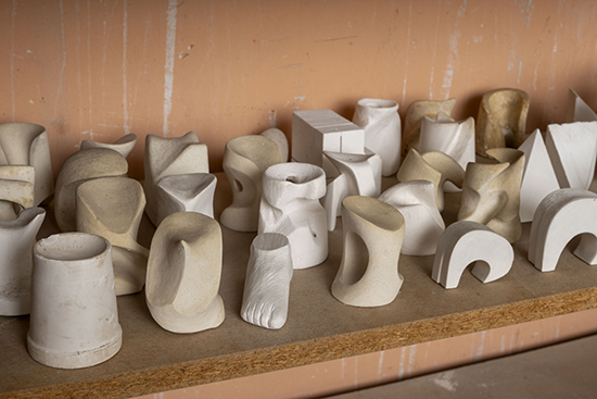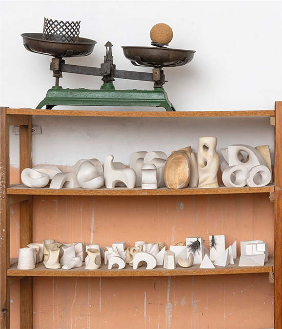 Selecciono para la exposición el laboratorio de pruebas, realizado en la década de los ochenta, en escayola, cerámica, madera y metal. Destaco sobre todo los bocetos en escayola que realizó la artista, sirviéndose de moldes a partir de envases de yogures, de los que se servía para jugar con sus sobrinos. ¿No es el juego la auténtica vida? ¿No entramos en el juego como un estado de perfección y capacidad de plenitud, que se esfuma cuando dejamos de jugar? El juego abre un espacio potencial y un tiempo de elaboración subjetiva, ofreciendo al artista una intensidad y libertad que se les supone a los niños. El juego no es solo una actividad, sino también, y sobre todo, una actitud y disposición. En Mertxe, la vivencia del juego es la condición abierta, imprescindible para la creación y abarca lo inútil, la ligereza, la fluidez, la candidez, el humor, lo ordinario y lo gratuito.