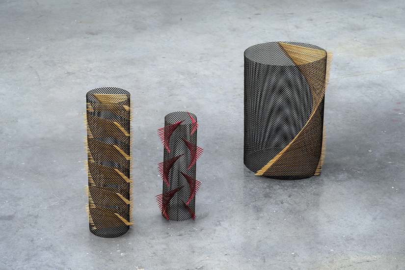A través de acciones como apoyar, soldar, acoplar, penetrar, doblar, torcer o ensamblar, la artista inviste de afecto a estos materiales y extrae sus posibilidades formales. Deja visibles los efectos de la producción industrial, permitiendo que el material lleve consigo la memoria de su formación. Trabajar con un objeto implica observarlo detenidamente, a veces guardarlo durante años en el estudio antes de volver a tocarlo. Significa reparar en sus detalles, maternarlo, individualizarlo y sacarlo del anonimato de la producción en masa. Reconocemos que las cosas, al igual que los cuerpos, son frágiles y eventualmente irreparables. Por ello, se convierten en objeto de nuestros cuidados.