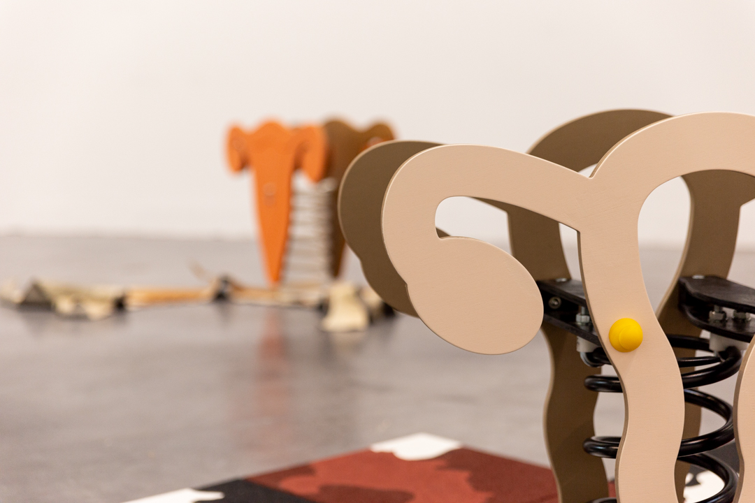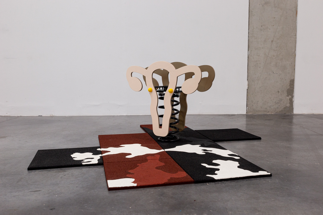 Baldosas de caucho y escultura en contrachapado, acrílico y muelle.