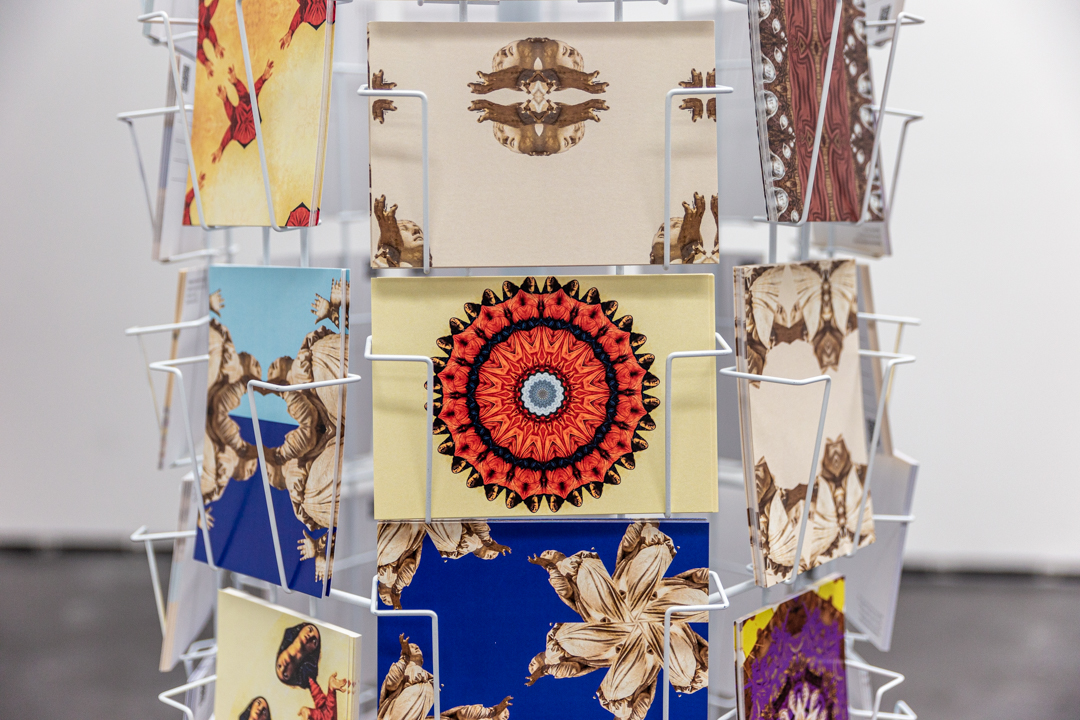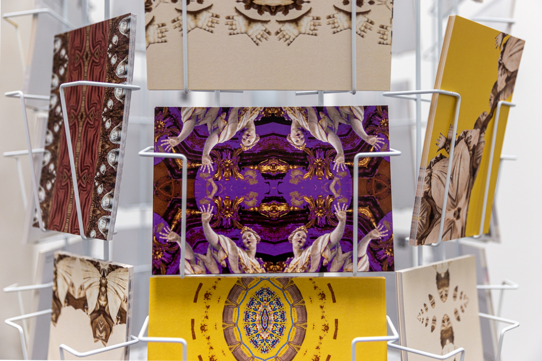 Las imágenes de las postales han sido generadas a través de lo que me gusta denominar “la máquina caleidoscópica”, ya sea mediante una app en el móvil o diseñando personalmente diferentes geometrías. Al introducir lo maquínico hago intervenir lo impersonal y el azar.