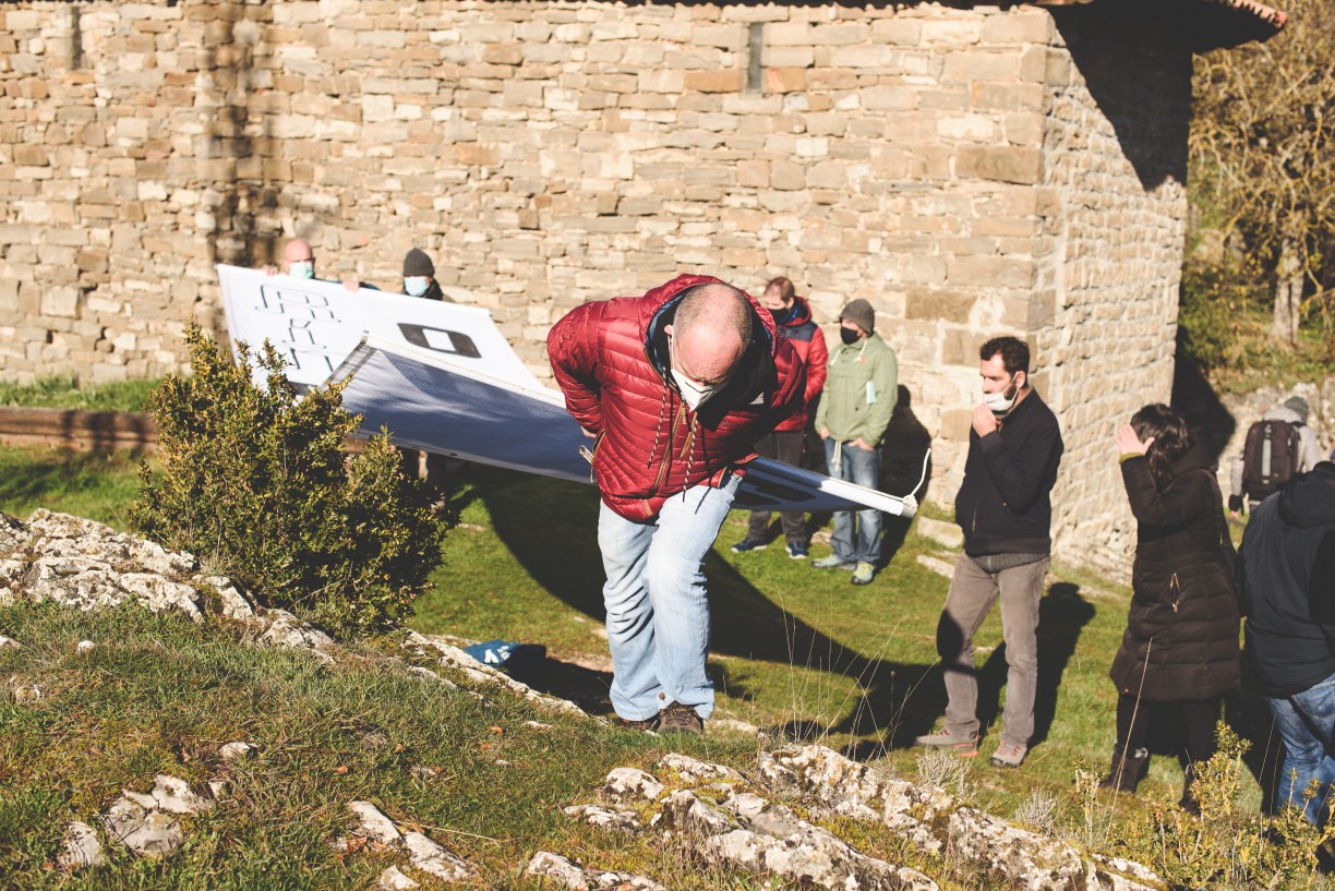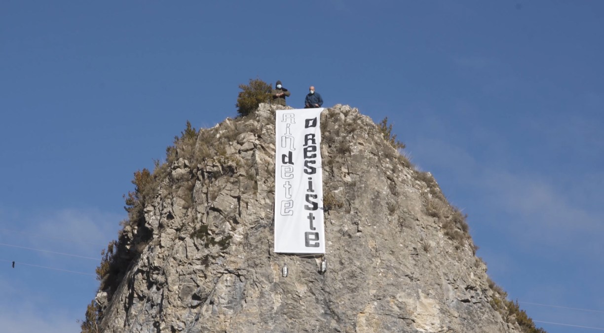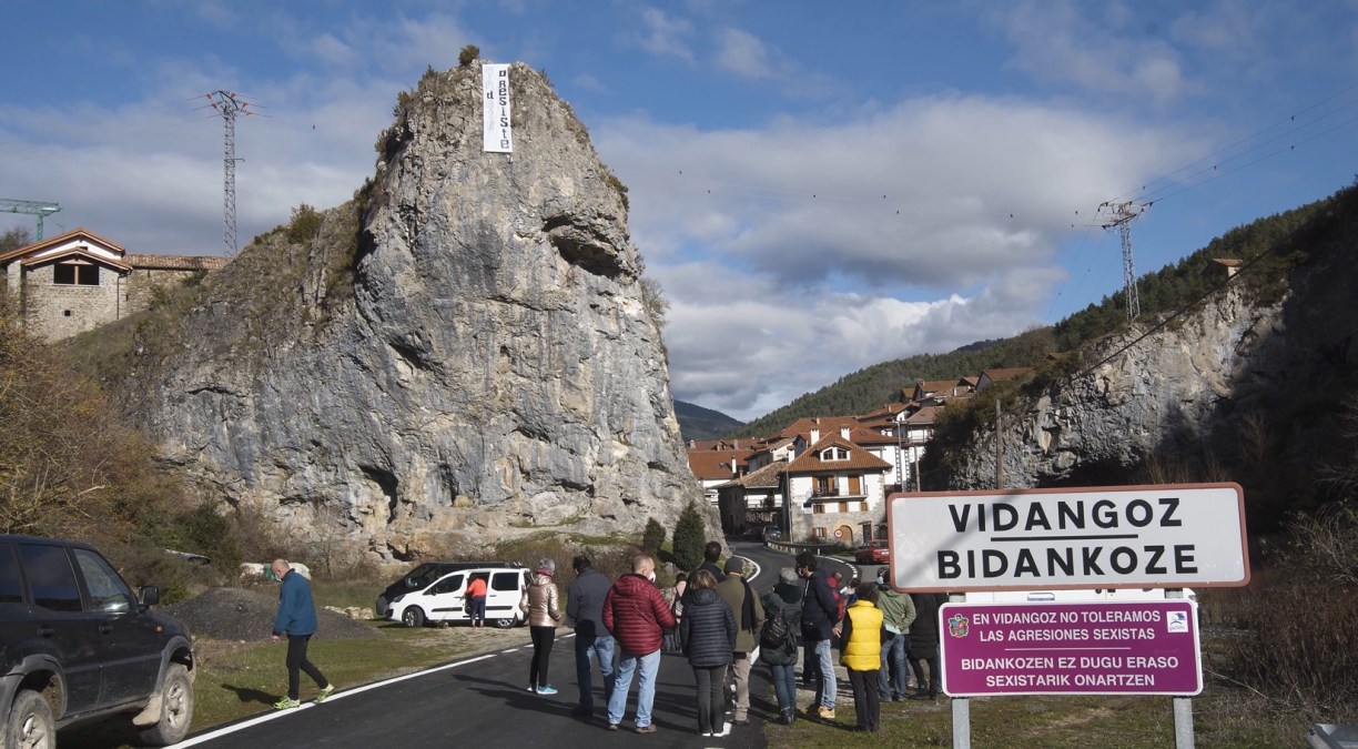 Para finalizar, realizamos una “peregrinación” a la peña Lapitxorronga, desde la cual colgamos una pancarta con el texto “Ríndete o resiste”.Con esta pancarta he querido poner en relación dos episodios ocurridos en Vidángoz.Un suceso particularmente interesante en la vida de Mariano Mendigatxa, que explica el porqué de una expresión que es conocida en Vidángoz: “Mendigatxa ríndete”. Es un episodio que sitúa al padre de Mendigatxa, en 1835, durante las guerras carlistas, huyendo, cercado en su casa y siendo increpado: “¡Mendigacha, ríndete!”. A lo que él responde: “Ni me he rendido ni me rendiré”.