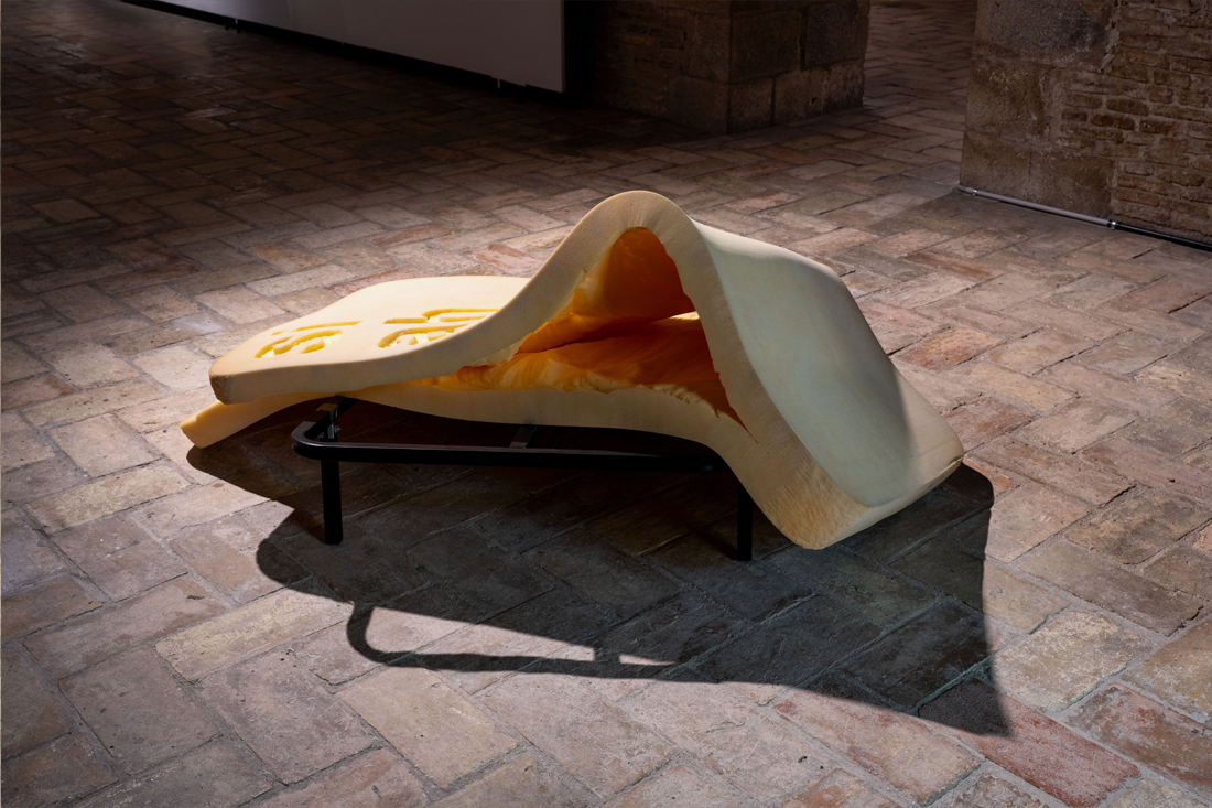 Sobre un somier de palabras, un colchón se pliega sobre sí mismo, generando un ángulo de precario equilibrio que sostiene su propio peso, su propia inercia material. La obra juega con la desactivación de la fragilidad, en tanto que las piezas se presentan estables, aunque de un modo ambiguo.